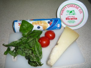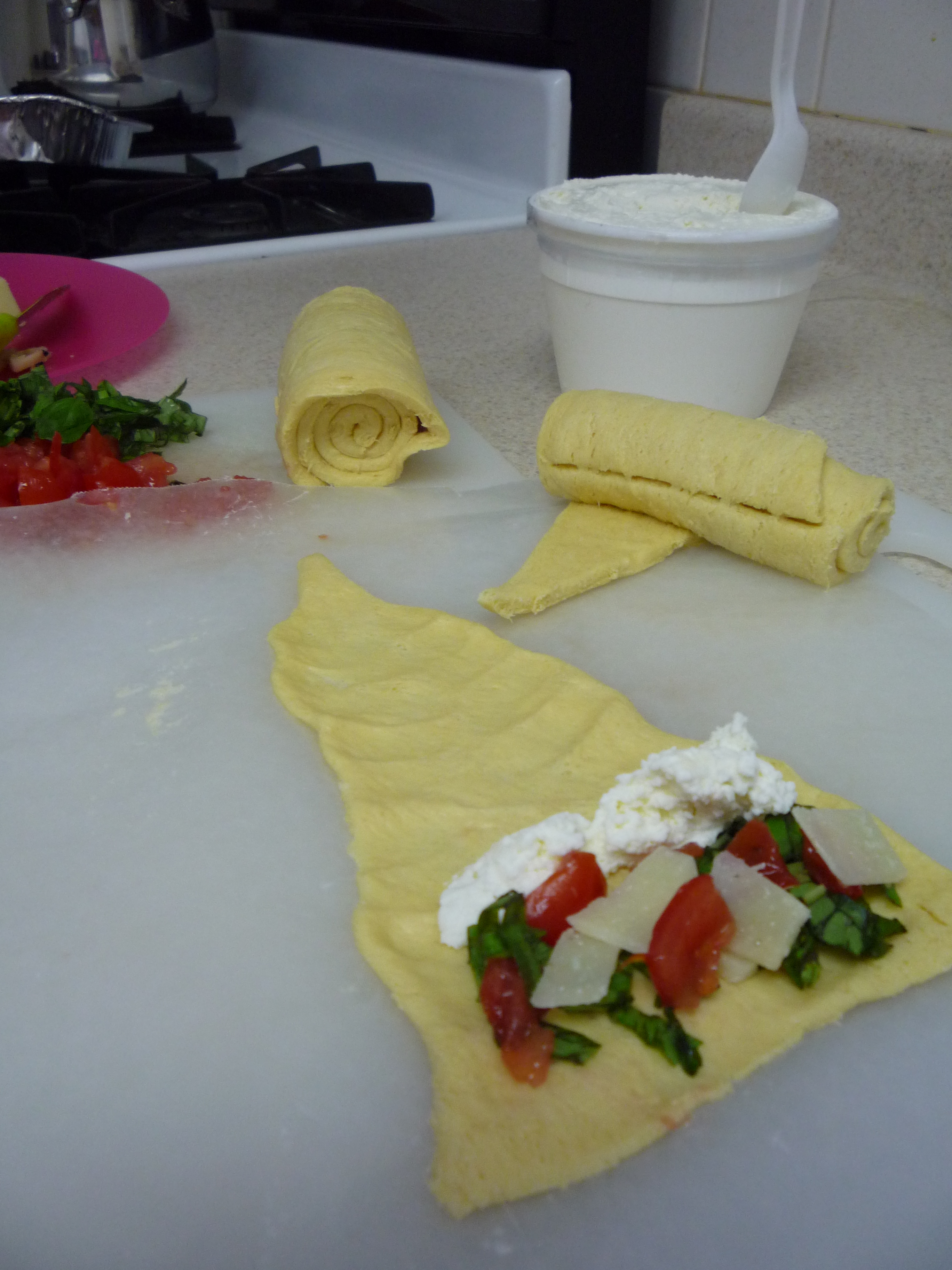 We go to the fridge to see what we can do for a quick, easy something, and pull out crescent rolls, ricotta, fresh basil, tomatoes and this amazing pecorino pepato I picked up at Russo’s. Well that was easy! Gourmet pizza rolls it is!
