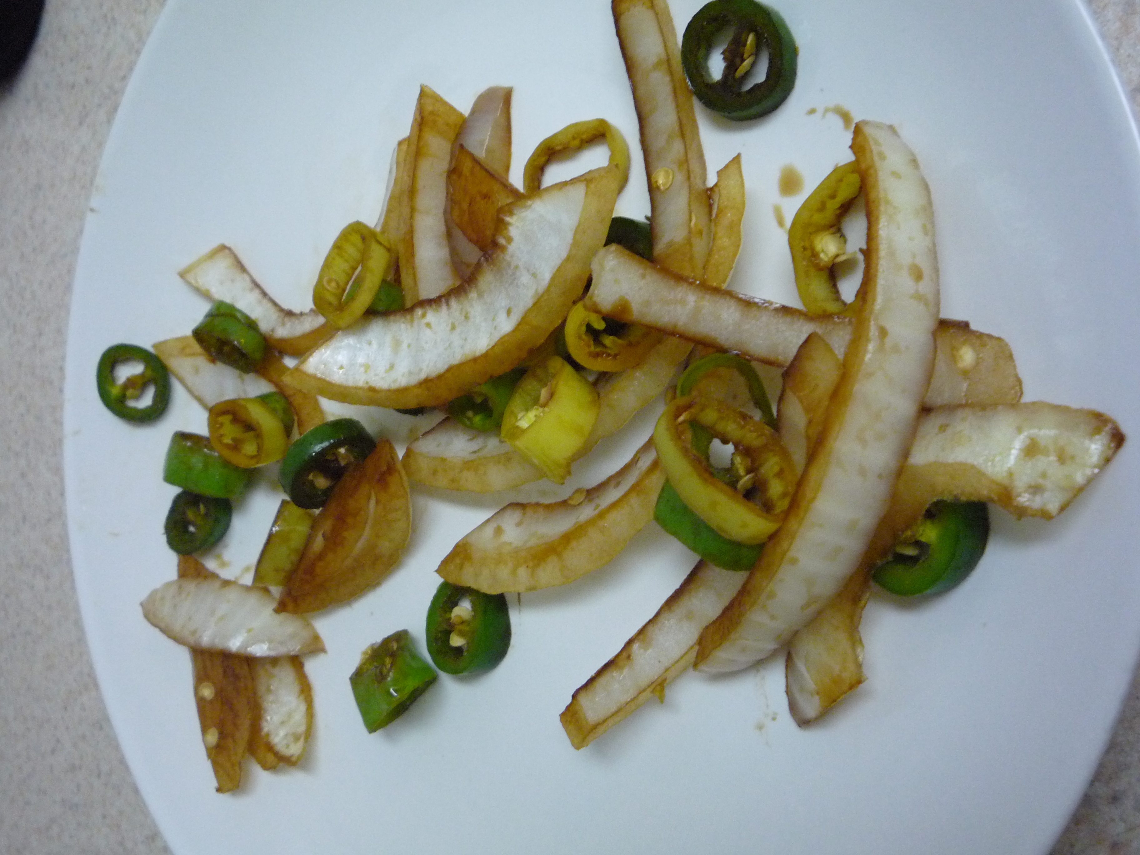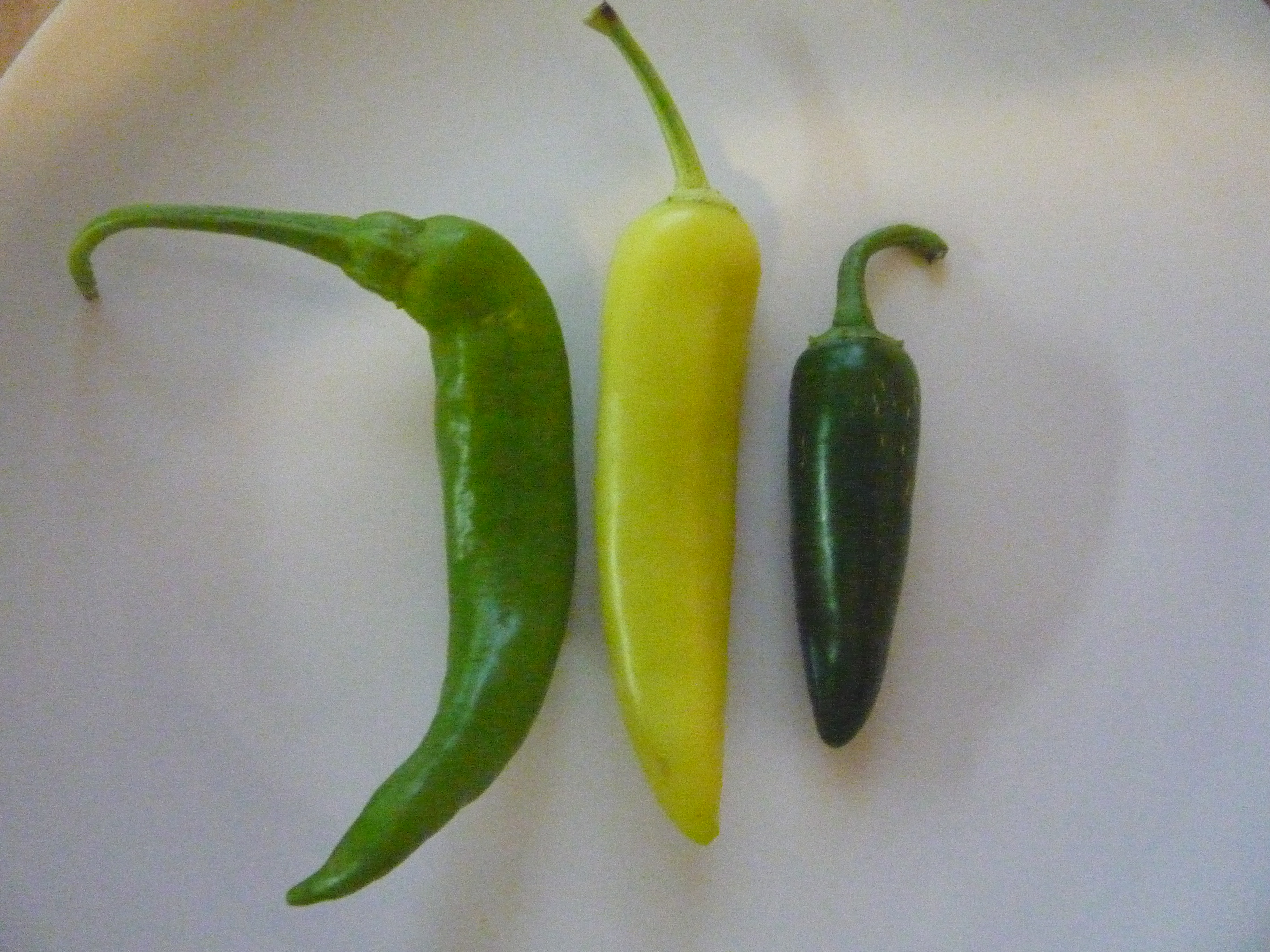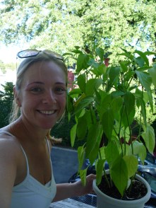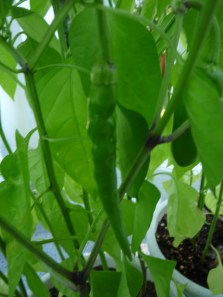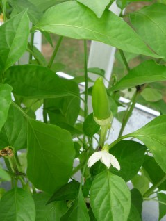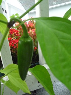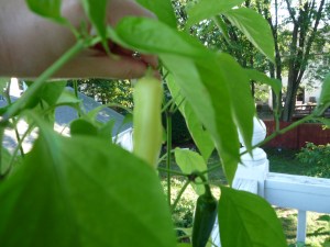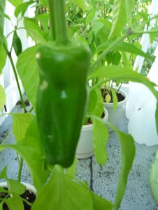 Can you believe that today, including the 4 peppers I have picked, we have 28 peppers! And there are over 30 that are still budding! I certainly can’t believe it. There are 4 types growing, the only one I can ID is the jalapeno (which is super spicy). There is also one that looks like a poblano (only one of these grew, probably because there was not enough root room), a long skinny pepper w/ bulges and a darker green color (maybe a cayenne?), a longer yellow-ish pepper that grew straight up (looks like a pepercini), and one more type that is only beginning to bloom now.