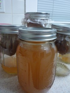 11. Now run the liquid through a cheese cloth or coffee filters in order to clarify the cider. This may actually be the slowest part of the entire process. (I hung coffee filters at the top of my jars and secured them with just the jar ring, so I was only able to pour small amounts at a time)