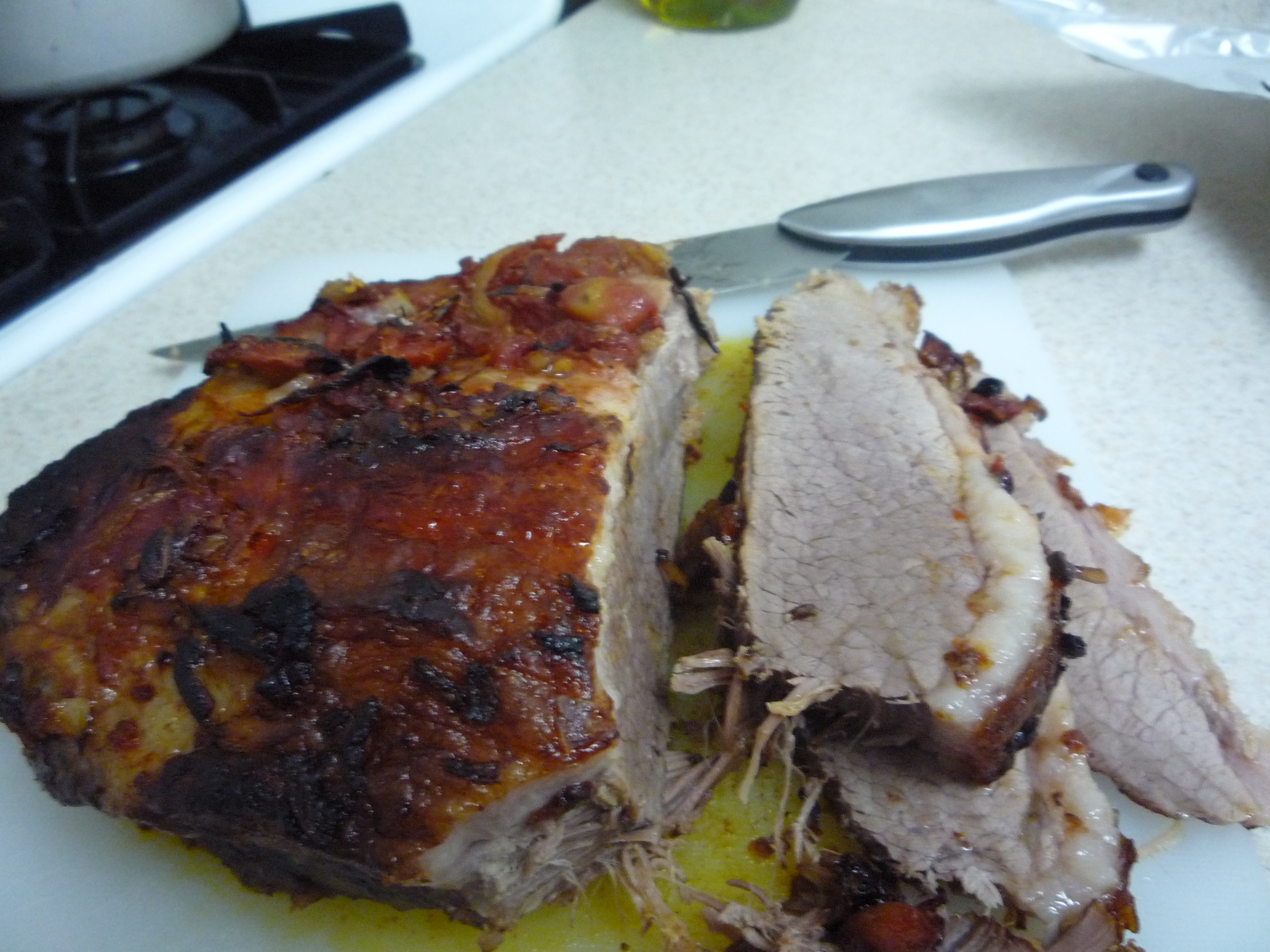 7. Uncover pan and continue to bake for 30 – 60 minutes, or until the top of the brisket has browned