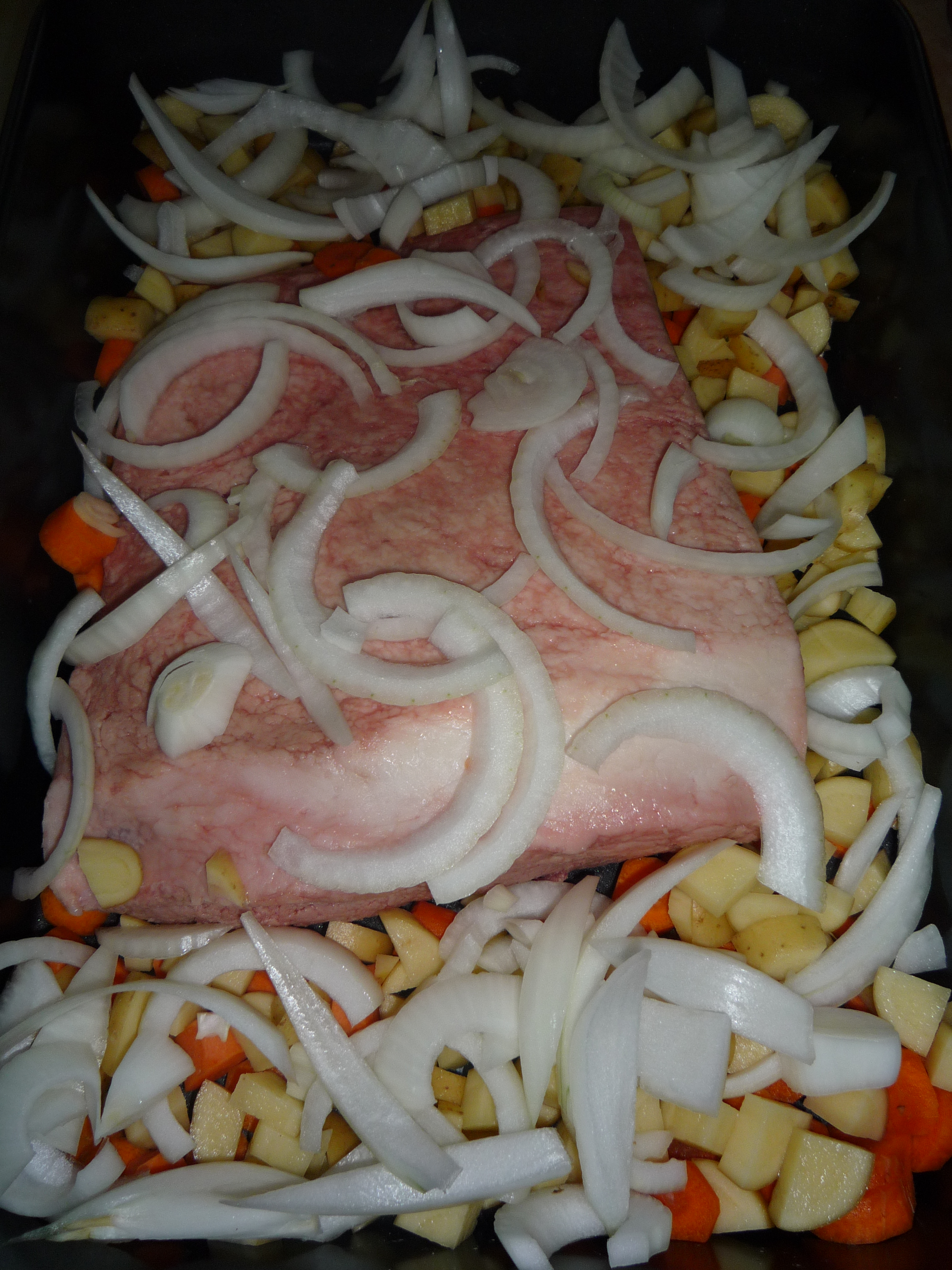 - Cover the dish with the sliced onions