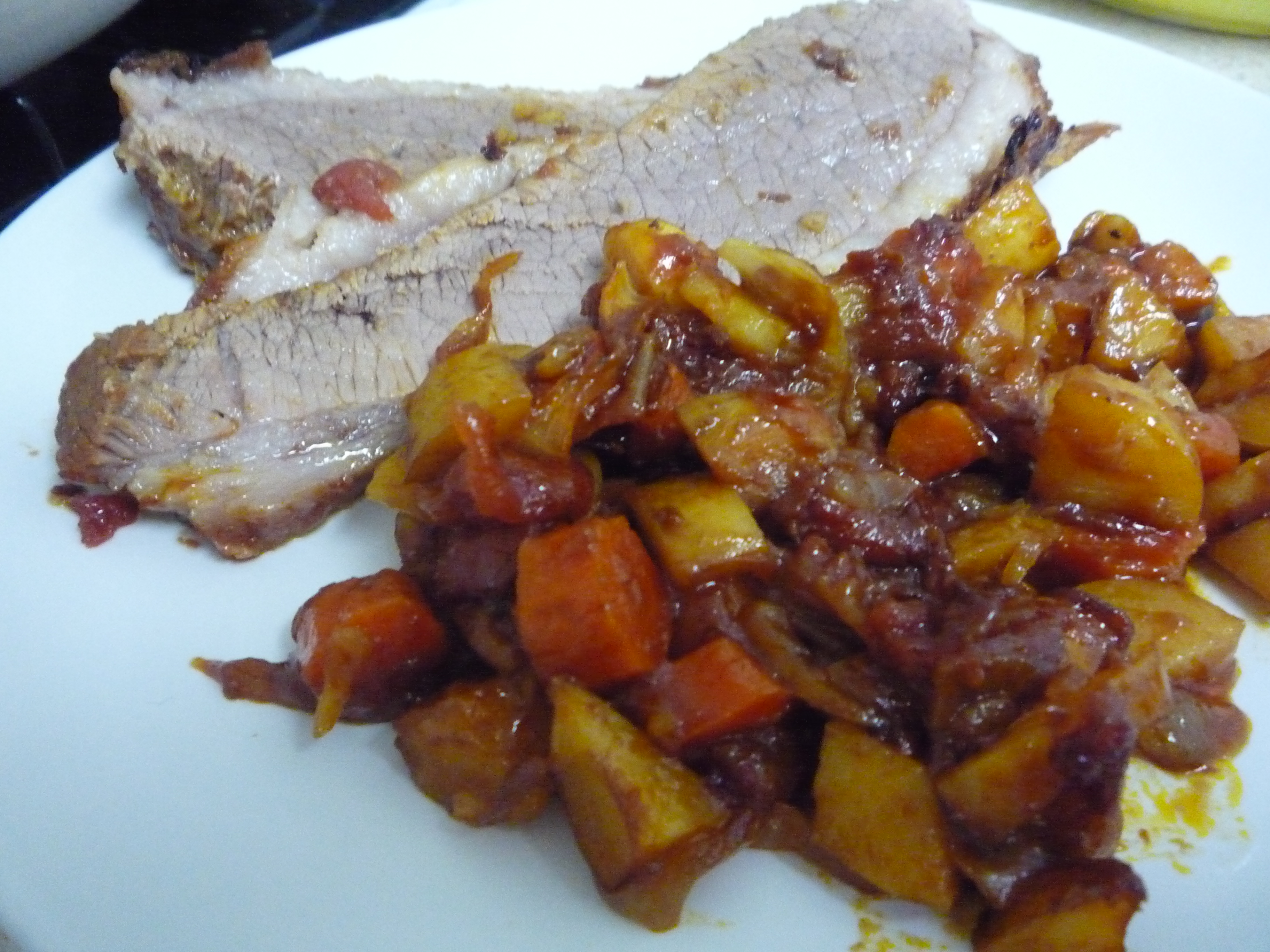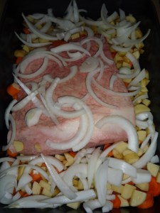 Armed with the secret ingredient, a mish-mash of recipes in my head, and a desire to try a brisket with chopped veggies, I set off to the kitchen to prepare my new year’s meal! I will warn you that not much of a gravy forms from this recipe, it is absorbed into the veggies. But we ate the veggies on top of the brisket, and it was the perfect balance of flavors! Enjoy!