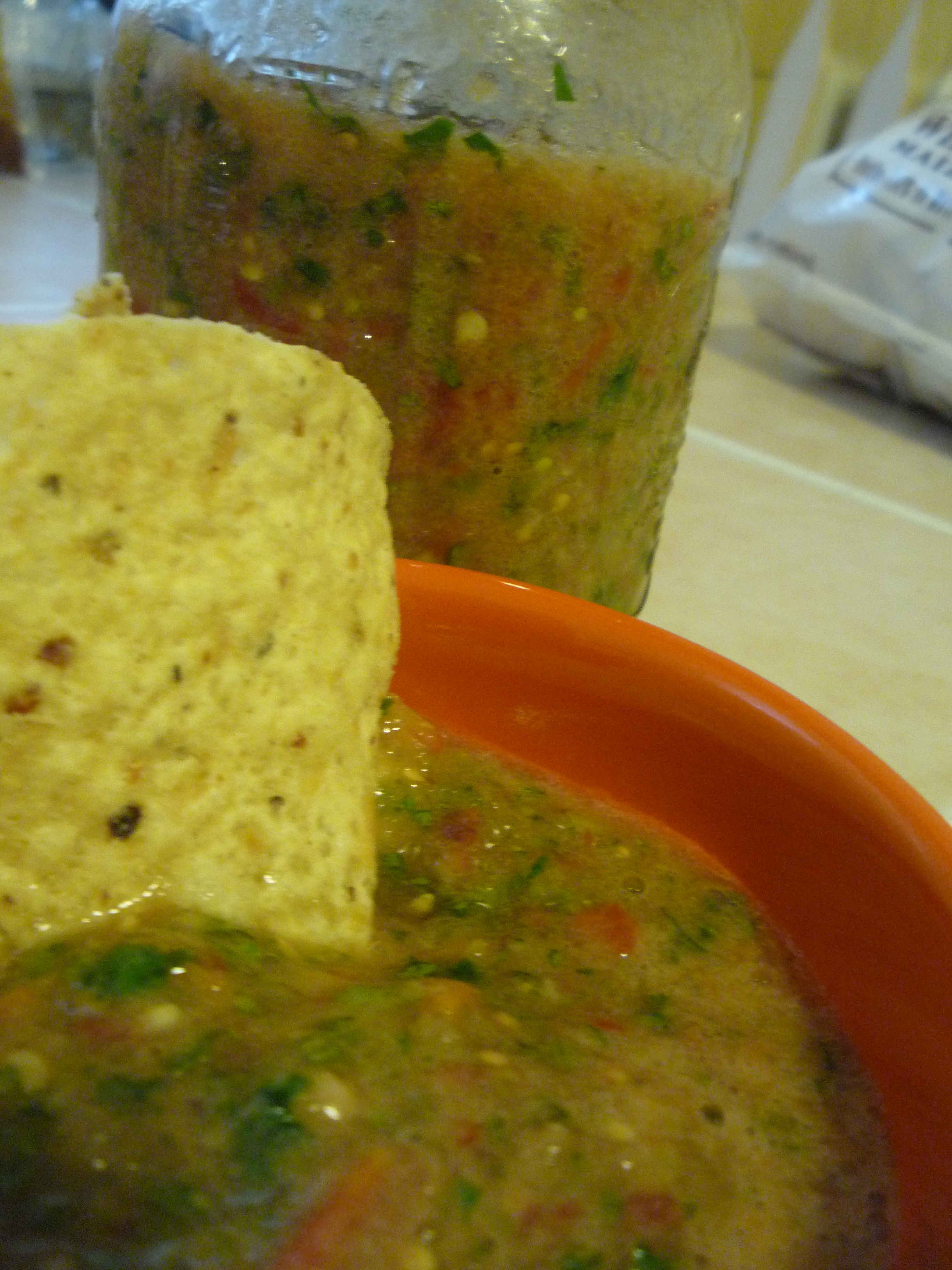 I, personally, like my salsa on the smoother side, and spicy! This recipe could, however be made chunky by hand dicing the tomatoes and onions, blending the remaining ingredients, mixing it all together and allowing it to chill for a few hours. BUT, this is the way I did it…