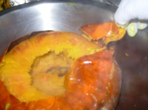 The meat will be falling away from the peel. Peel the pumpkin while it is still hot, using tongs so I won’t burn my fingers. When it cools the peel starts to stick, so it is best to get it done while it is hot.