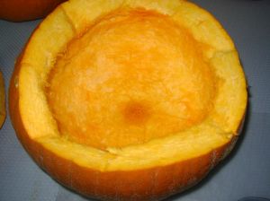 Preheat the oven to 350. Cut the top of the pumpkin off and gut it like you would if you were going to carve a face on it. I like to use a flat metal ice cream scoop to clean the seeds and fibers out. You could use a metal spoon instead. You don’t want to use anything with sharp edges that will scar up the inside.