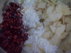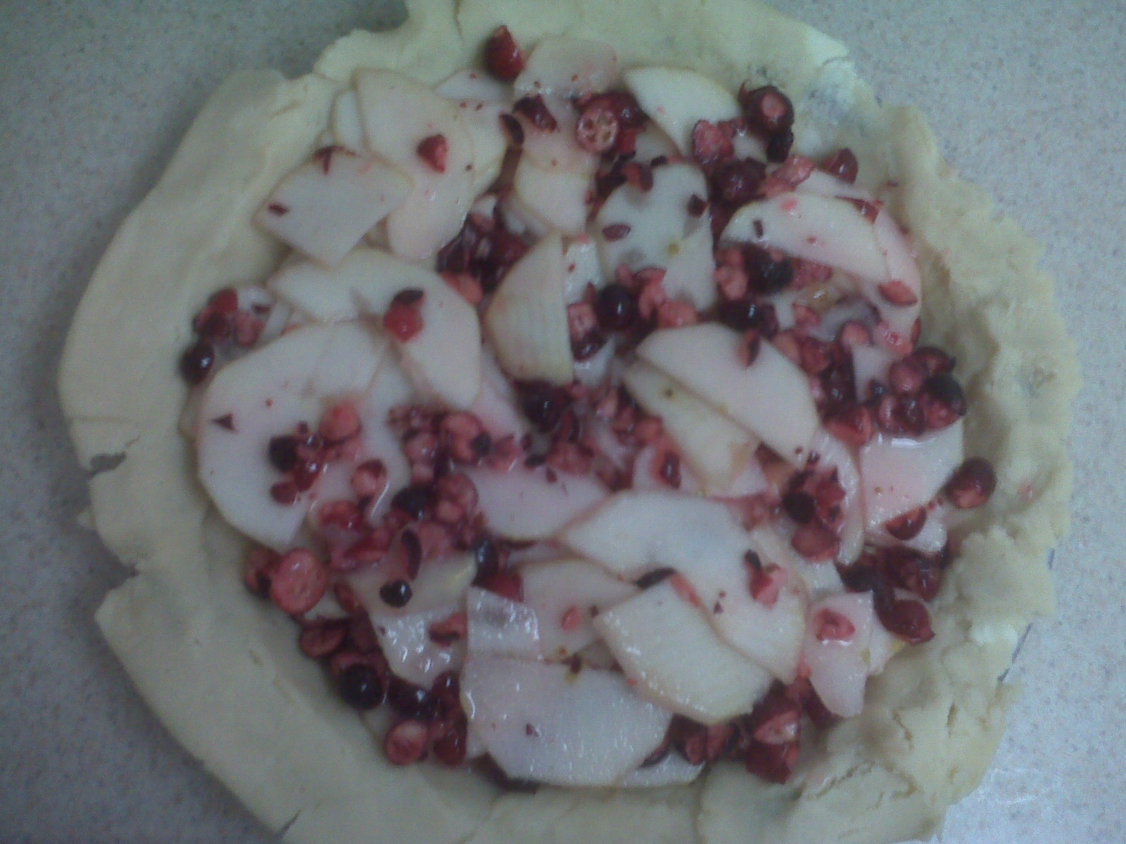 3 hours later and I am starting to feel better and ready to tackle this baking thing again. Luckily, nothing in the kitchen was polluted. I washed off my mandolin (which some how did not get polluted either) and continued with my pear slicing…very slowly and carefully.