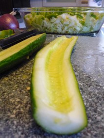 - Cut the cucumber in half length-wise and de-seed it by running a spoon down the middle of each half to remove the seeds (you may discard the seeds)