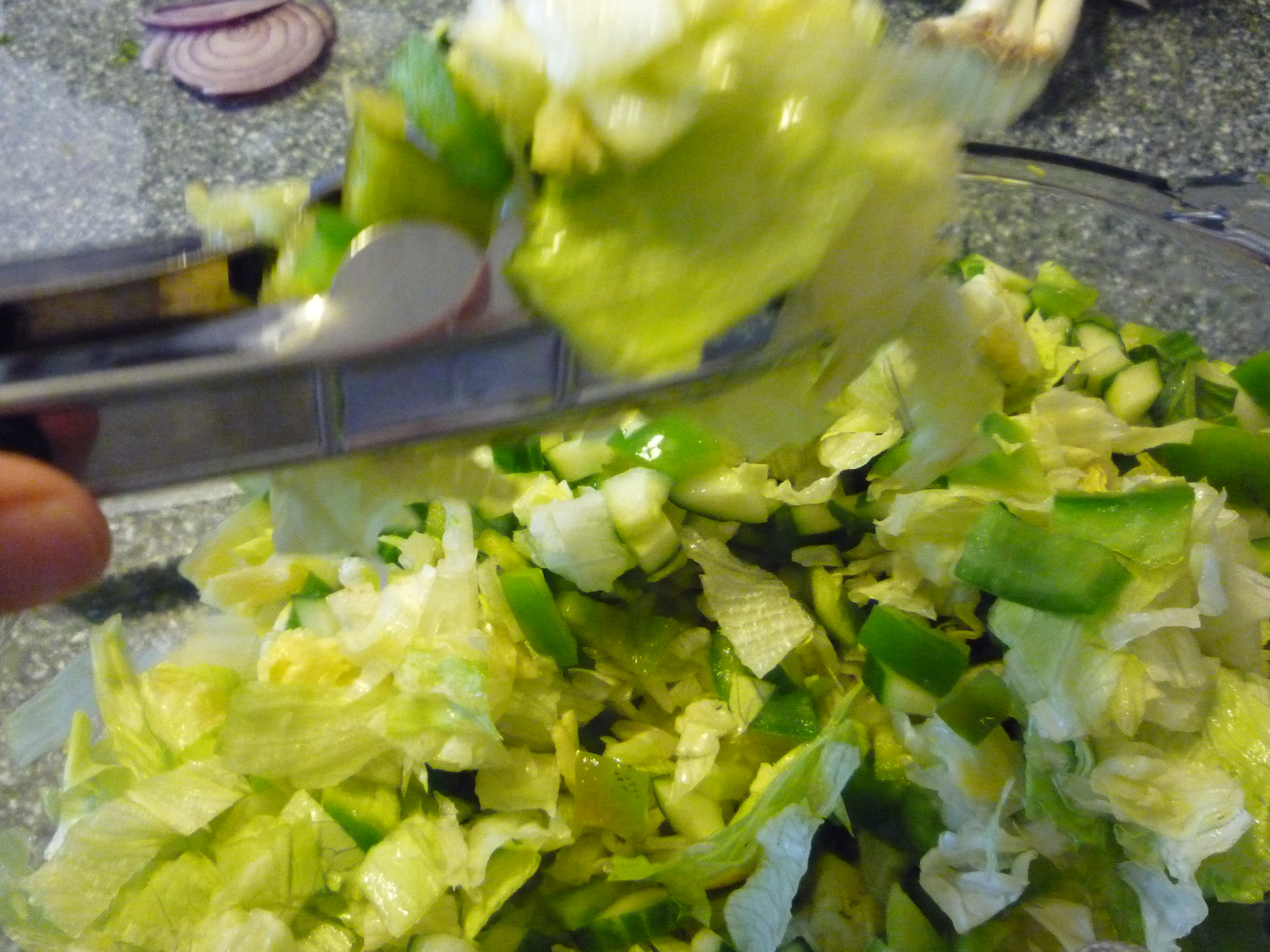 allow to marinate while you prepare the salad - Place chopped or shredded lettuce into salad bowl