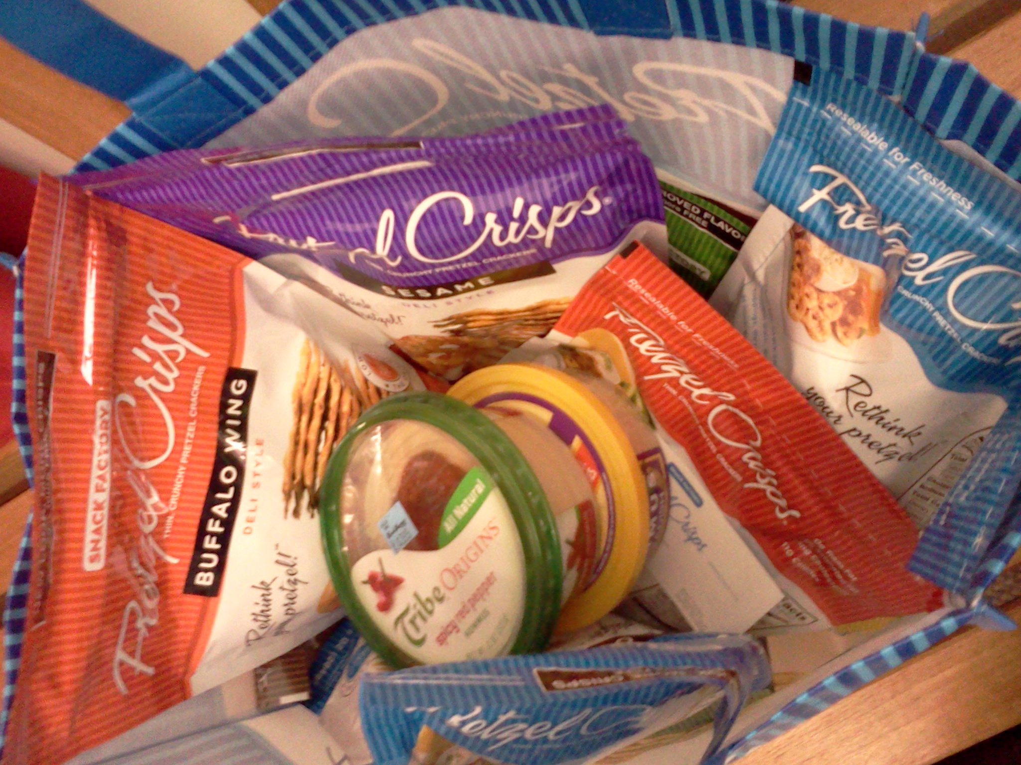 I tweeted about our challenge on Monday, and the amazing Jackie of Pretzel Crisps replied, and arranged to bring Lara and I some delicious, all natural, healthy, Pretzel Crisps! She even included some Tribe Hummus, doing her research and knowing my favorite is the horseradish!