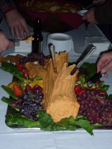 In the middle of the room is some knoshes, including an actual, literal cheese log! You have to appreciate the artistry in this!