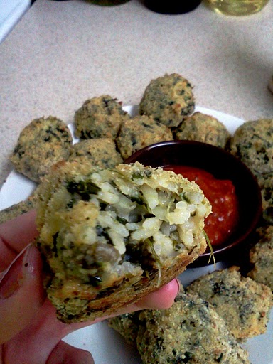 Roll rice mixture into 1 inch balls, dredge through egg mixture and then through bread crumb mixture