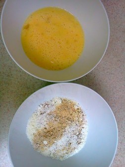 Arrange beaten eggs in a bowl and combine romano and bread crumbs in a second bowl