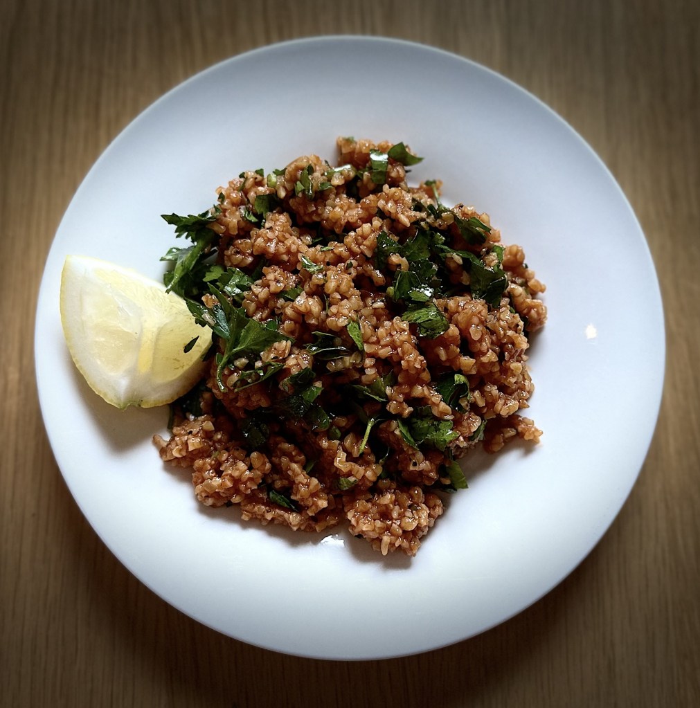 What is this amazing dish you ask? Well, it is bulgar wheat with lemon, tomato, spices, parsley, and spring onions.