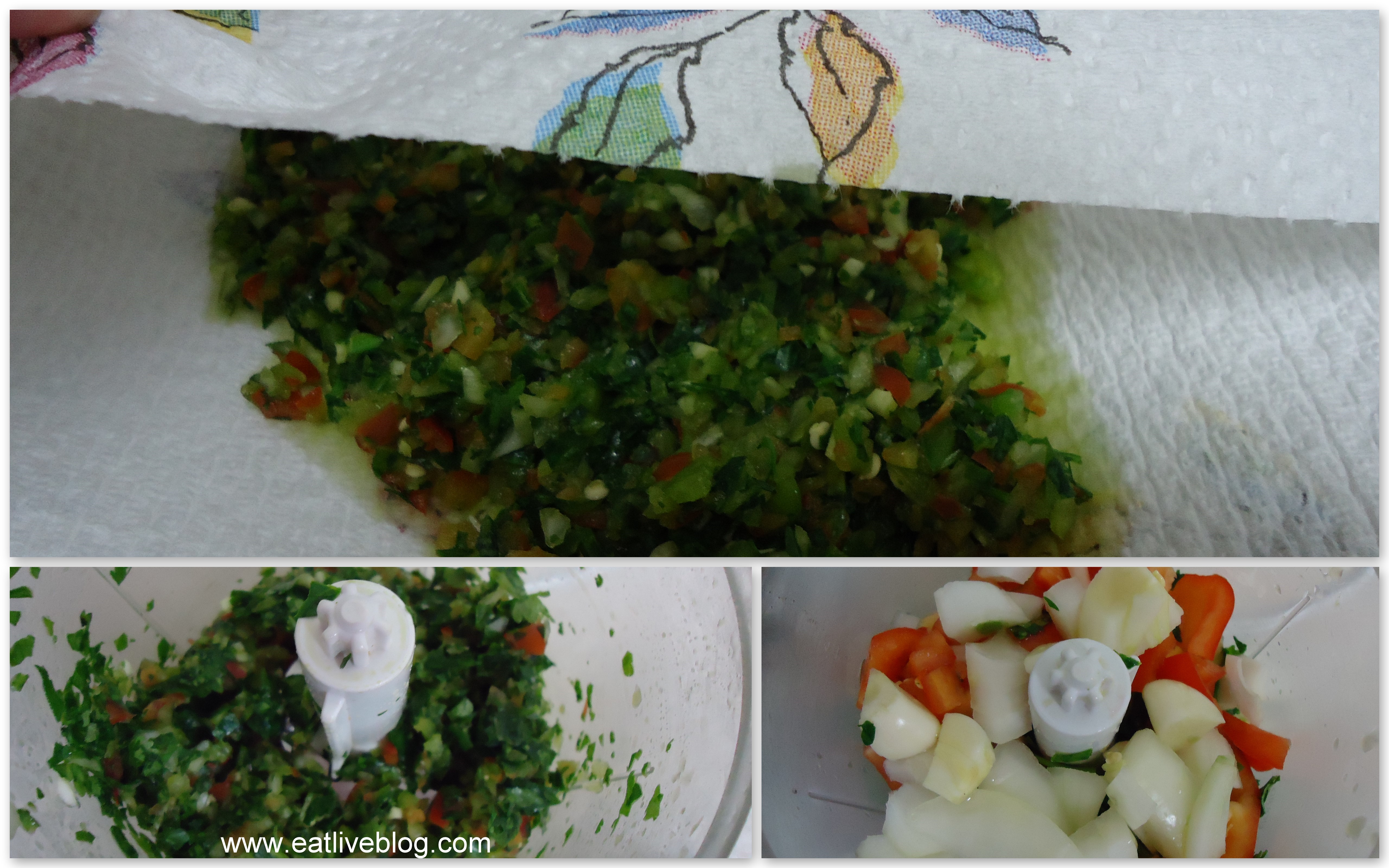 - Line a plate with paper towels and pour veggie mix on top of towels. Blot with another paper towel to remove some moisture.
