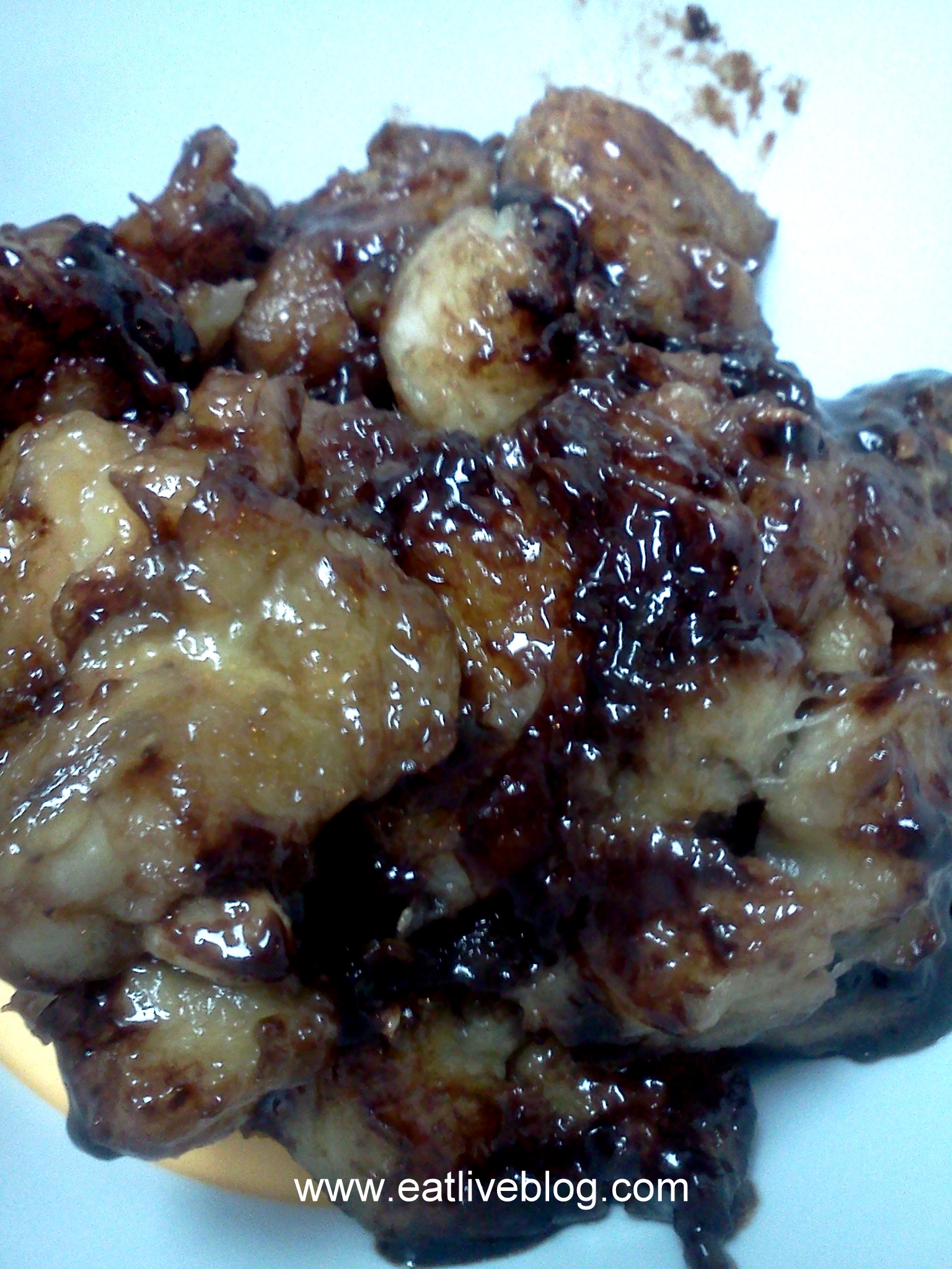 I heated my pan and add 1 tbsp of Olivio (butter substitute). When it melted, I threw in the banana slices and cooked until the bottom was brown. Then I flipped them. I then gave the bananas a good dosing of rum and let that cook until it dissolved. Next, the bananas got a fair dressing of maple syrup and 2 tablespoons of the chocolate. I waited for the chocolate to melt before flipping the bananas again. Then….I seared the granola bite in the pan….the things we do for love….