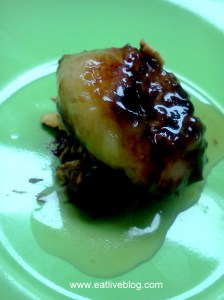 Armed with his half of a granola bite, bananas, maple syrup, rum and Sassy Sauce Bittersweet Chocolate I won from Karen’s monthly contest, I accepted the challenge. The result…why it was amusing!