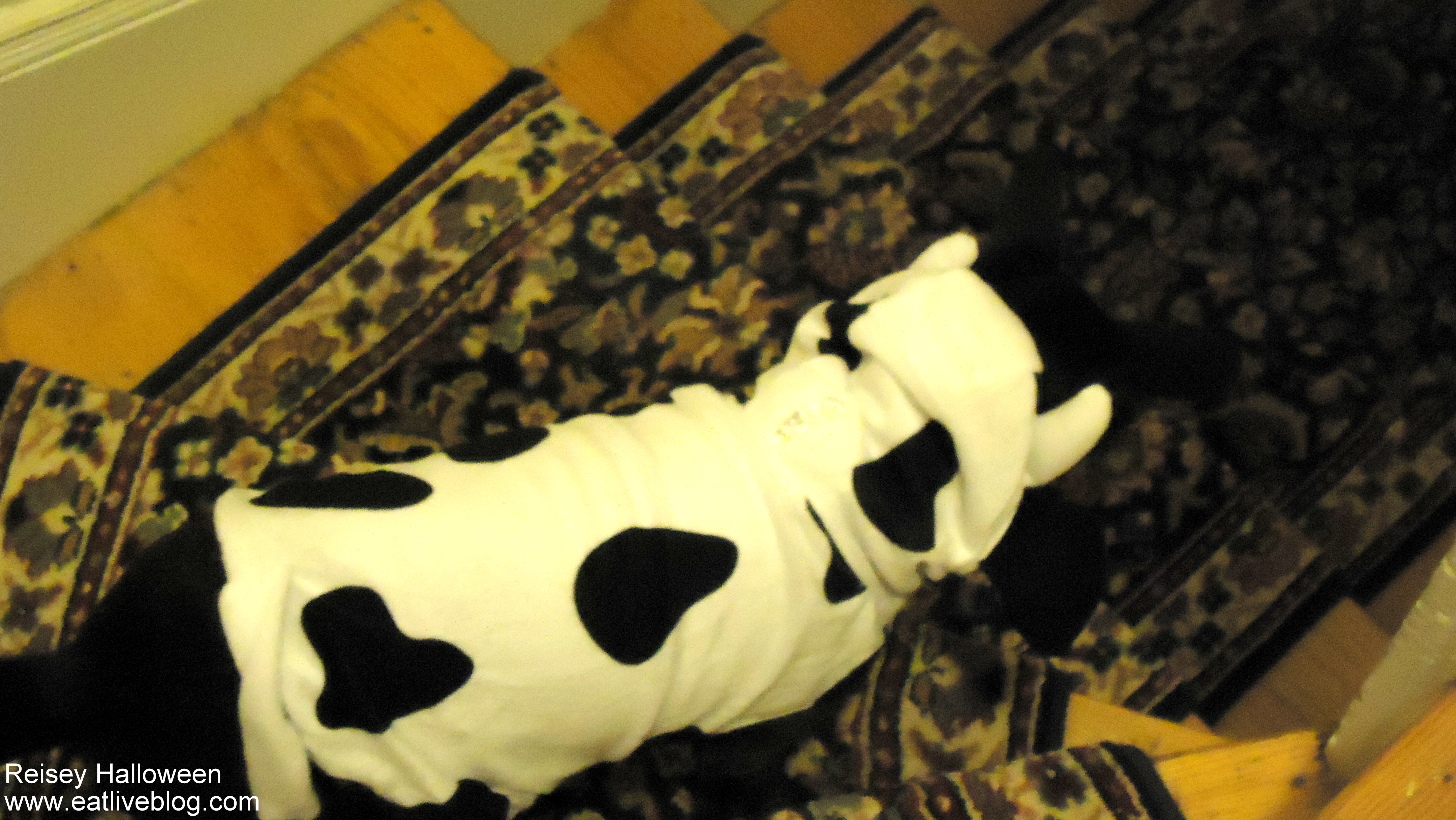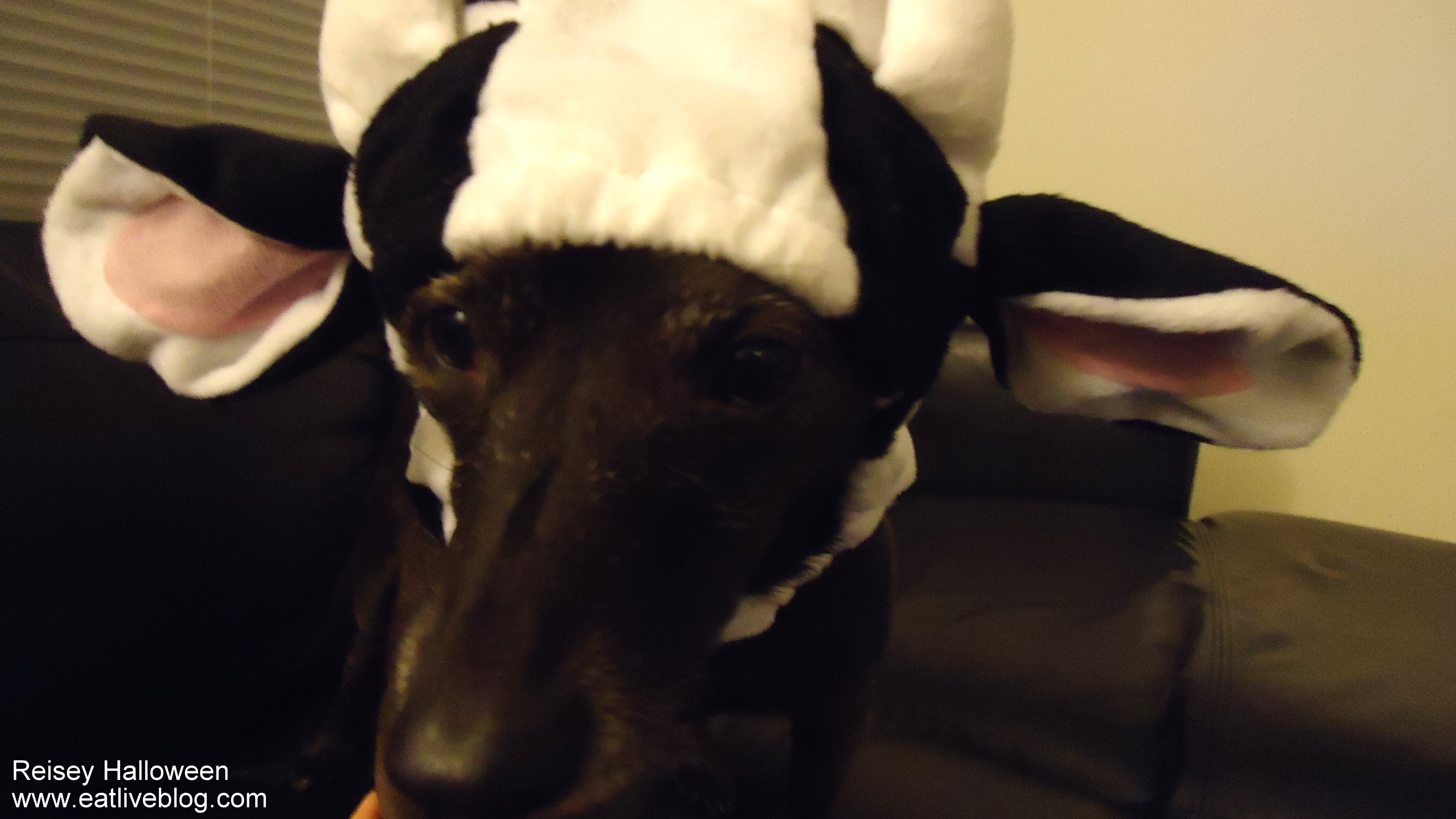 But it IS Halloween, and its time for Reisey to take one for the team! When this cow costume arrived from Petsmart.com, we could not have been more giddy to get it on her! After a game of chase to catch her (she knew what was coming), Reisey finally submitted and this cuteness is what came out of the chase: