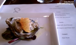 We were off to a great start, and things were about to get better. Julia got our attention and explained the next dish, Oyster Escabeche w/ blood orange, in perfect detail. Here’s an odd fact, I don’t like cooked oysters, only raw. Kind of backwards, I know, but none-the-less true. So when “seared” showed up in the oyster’s description, I was skeptical. But when the dish arrived…it was absolute perfection and made me instantly want more. Score one for the amuse bouche!