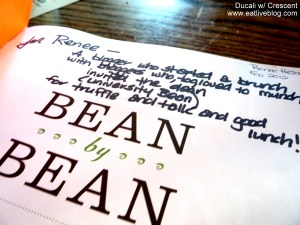 And so the lunch went. We talked a little about beans, but mostly about writing. And you could see straight into Crescent and how she was born to do exactly what she is doing. It was really absolutely inspirational. I can’t do enough justice to our conversation, but if I have peaked your interest enough please check out Crescent’s interview on On Point with Tom Ashbrook. Even on the radio you can feel the glow of Crescent.