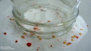 On a plate the same width as the glass you will be using, mix together the super fine sugar and crushed peppers