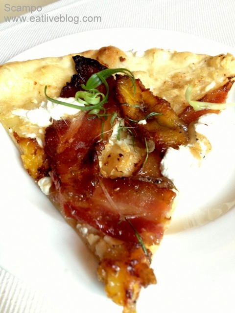Next, the waitress brought us an abbreviated version of their Caprese Salad. While the flavored oils lacked a little flavor, the balsamic and the mozzarella were heavenly. This was the perfect dish to freshen up our pallets after the calamari and before…(drum roll please)…the Bacon Pizza, with bacon that is cured in apple cider , smoked in applewood and with smashed ripe plantains, carmalized onions and whipped ricotta. AKA, heaven.