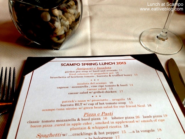 A few weeks ago I received an invitation to come in and sample Scampo’s Spring Lunch Menu. I was thrilled for a number of reasons, the least being it is a 5 minute walk from work, the most being…well, its Lydia Shire’s Scampo!